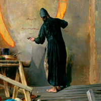 Горкин идет расстроенный, кричит на меня в сердцах: «Тебе говорю, отстань ты от меня, ради Христа!» Но я не могу отстать. Он идет под навес, где работают столяры, отшвыривает ногой стружки и чурбачки и опять кричит на меня: «Ну, чего ты пристал?..» Кричит и на столяров чего-то и уходит к себе в каморку. Я бегу в тупичок к забору, где у него окошко, сажусь снаружи на облицовку и спрашиваю все то же: возьмет ли меня с собой. Он разбирается в сундучке, под крышкой которого наклеена картинка — «Троице-Сергиева лавра», лопнувшая по щелкам и полинявшая. Разбирается и ворчит: