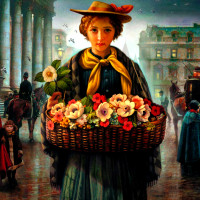 Молодая девушка, в шляпе, перчатках и плаще, сидит на подоконнике, повернувшись всем телом, чтобы видеть расстилающийся за окном пейзаж. Она сидит, опершись подбородком на руку, свесив небрежно другую руку, в которой она держит томик Шекспира, заложив палец на той странице, где она читала. Часы бьют шесть.