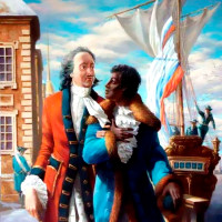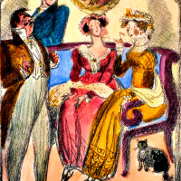 На другой день, ровно в двенадцать часов, гробовщик и его дочери вышли из калитки новокупленного дома и отправились к соседу. Не стану описывать ни русского кафтана Адриана Прохорова, ни европейского наряда Акулины и Дарьи, отступая в сем случае от обычая, принятого нынешними романистами. Полагаю, однако ж, не излишним заметить, что обе девицы надели желтые шляпки и красные башмаки, что бывало у них только в торжественные случаи.