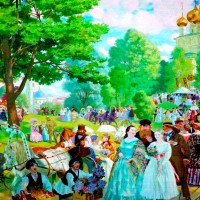 Невысокое солнце светит на лесенку амбара, по которой взбегают плотники. Вытаскивают «ердань», — балясины и шатер с крестями, — и валят в сани, везти на Москва-реку. Все в толстых полушубках, прыгают в валенках, шлепают рукавицами с мороза, сдирают с усов сосульки. И через стекла слышно, как хлопают гулко доски, скрипит снежком. Из конюшни клубится пар, — Антипушка ведет на цепи Бушуя. Василь-Василич бегает налегке, даже без варежек, — мороза не боится! Лицо, как огонь, — кровь такая, горячая. Может быть, исхитрится завтра, одолеет Ледовика?..
