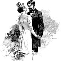 Молодой вельможа и молодая дама, одетые в необыкновеннейшие костюмы зеленого, красного и желтого цвета, беседовали под голубым деревом, на котором зрели белые плоды. Большой кролик, тоже белый, пощипывал серую траву.