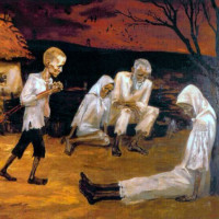 — Ох-хо-хо! И вышла из дыма саранча на землю, и дадена была ей власть, кою имеют скорпивоны… — В длинной, до колен, белой рубахе, сам длинный, прямой, бестелесный, но с тяжелым кирпичным черепом, стоял в стороне Санко Овин. — Царем над собою саранча поимела ангела бездны по имени Аваддон… И сказано дале: энто только одно горе, аще два грядет… Ох-хо-хонюшки! Аще два ждите… — Дед Санко постоял, качнулся раз, отдохнул немного, качнулся другой раз, с натугой переставил тяжелый валенок, пошел, опираясь на сучковатую клюку.