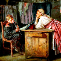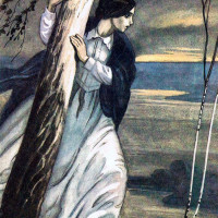 Леший сидит на сухом пне. Все небо покрывается прилетевшими из-за моря птицами. Весна-Красна на журавлях, лебедях и гусях спускается на землю, окруженная свитой птиц.
