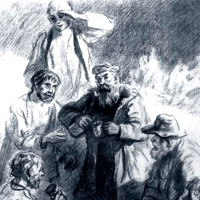 — Братцы… разве я знал? Стрелял… потому что боюсь. Иду из Нового Афона… в Смоленскую губернию… господи! Лихорадка смаяла… как солнце зайдет — беда моя! От лихорадки и с Афона ушел… столярил там… столяр я… Дома жена… две девочки… три года четвертый не видал их… братцы! Всё ешьте…